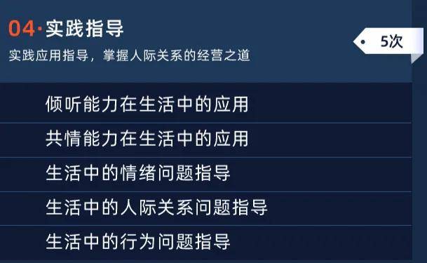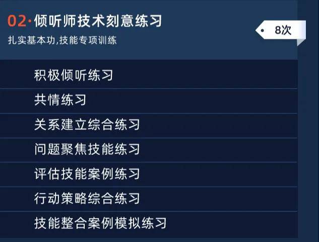 首先,你会学习倾听师所需技能,习得涵盖关系建立、问题聚焦和行动策略三大模块的核心能力。