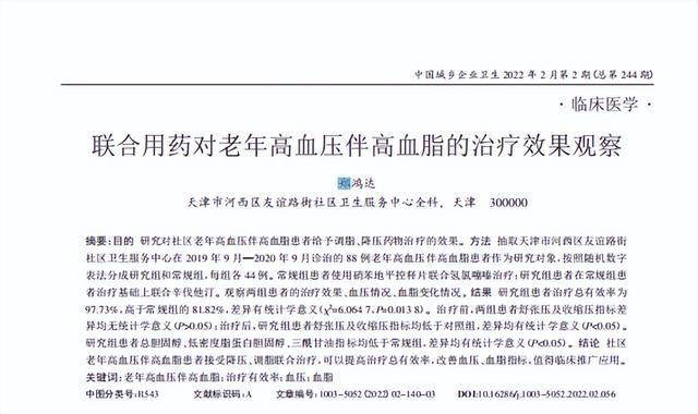 郑鸿达.联合用药对老年高血压伴高血脂的治疗效果观察,中国城乡企业卫生,2022-2