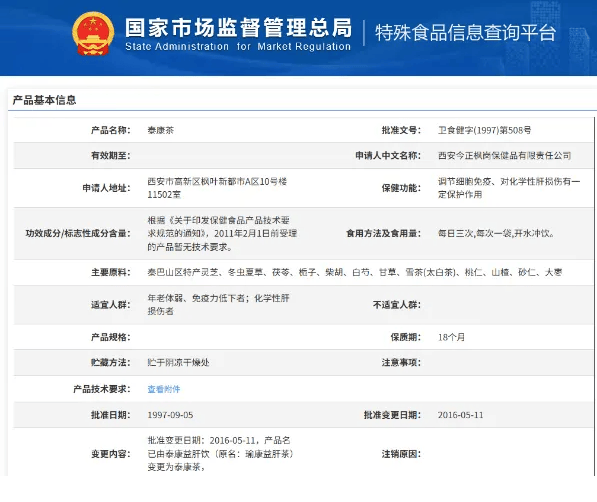 但官方备案信息却显示,泰康茶的实际功效与宣传相去甚远。国家市场监督管理总局官网查询结果显示,泰康茶的批准文号为卫食健字 (1997) 第 508 号,其备案的保健功能仅有两项:调节细胞免疫、对化学性肝损伤有一定保护作用,备案的适宜人群为年老体弱、免疫力低下者及化学性肝损伤者。一位三甲医院肝病学科医生解释,化学性肝损伤有严格的界定,仅指化学物质或药物引起的肝损伤,熬夜、饮食不规律等日常原因导致的肝损伤并不在其保护范围内,这与广告中宣称的 “养肝护肝” 完全是两个概念。