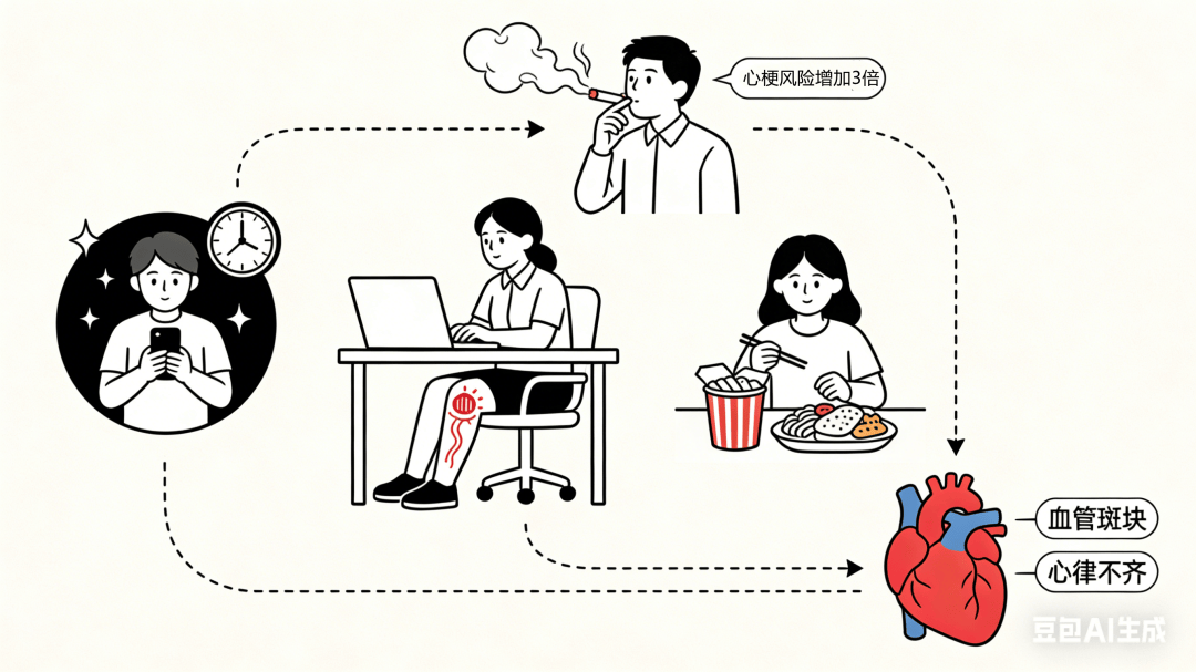 长期熬夜与睡眠不足:连续3天以上每天睡眠不足4小时,心肌耗氧会增加3倍,血管痉挛概率提升至平时的5倍。长期每天睡眠不足6小时,会加速血管斑块形成。