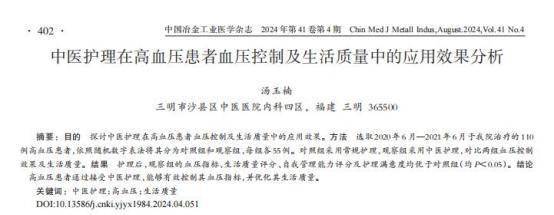 [1]汤玉楠.中医护理在高血压患者血压控制及生活质量中的应用效果分析,中国冶金工业医学杂志,2024-08-01