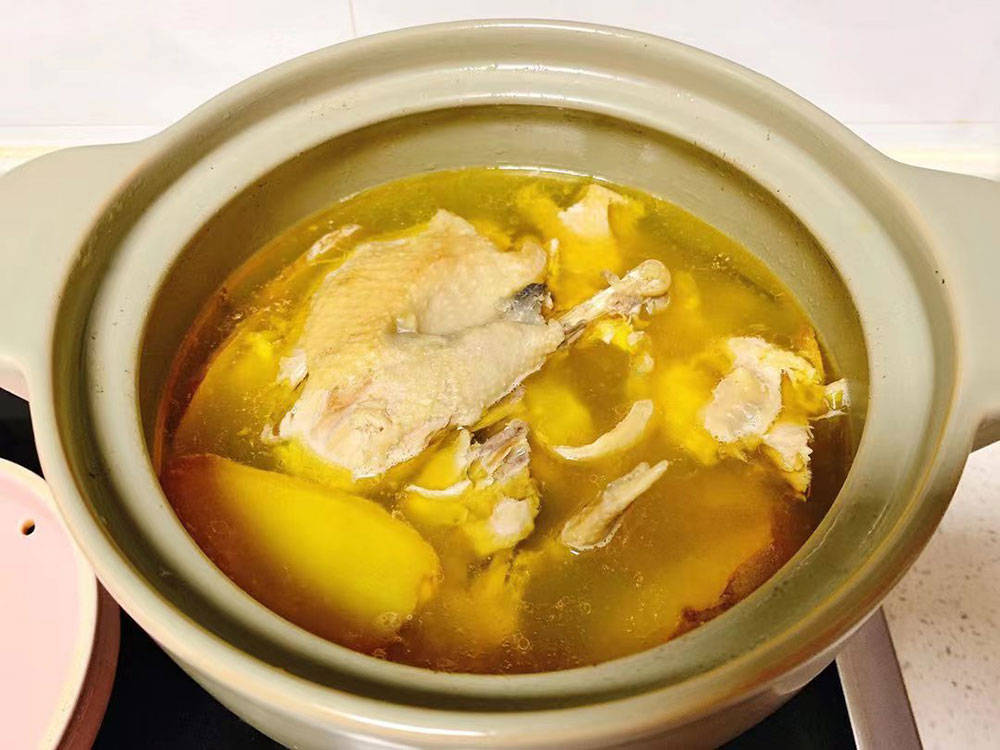 3、接下来才是正式炖汤,放到砂锅里,受热更均匀,添足水的同时,也往里边丢些生姜,这时候要快速大火煮开,然后调节至小火,慢慢咕嘟。