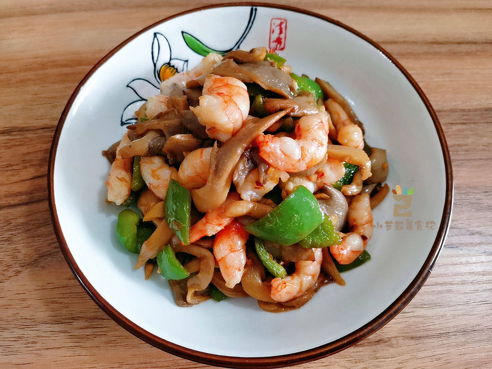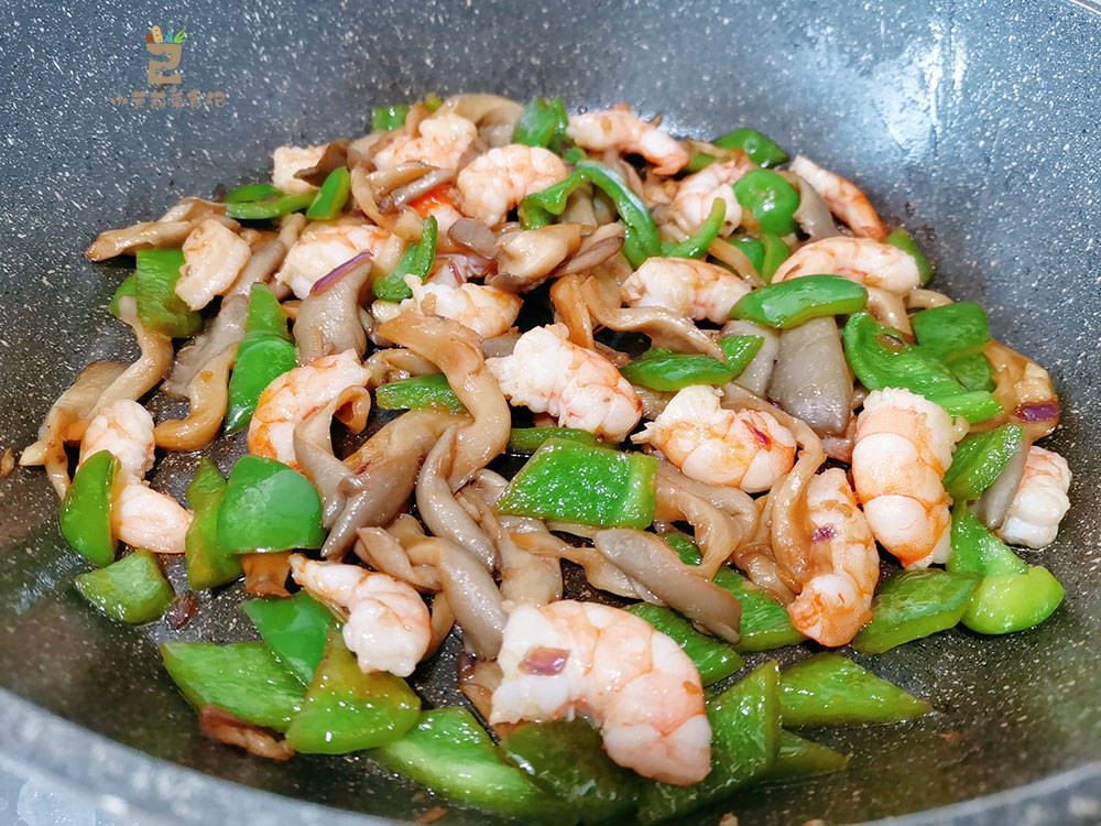 4、重新起锅,蒜蓉和姜都来点在锅底烧热,虾仁放里边,炒到变色时,青椒以及平菇放进去,与之一起炒。调些酱油,盐,把食材的味道调整好,即可装盘。