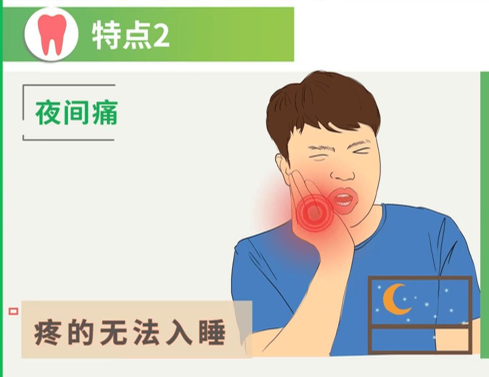 它不光白天疼,晚上还疼,而且常常因疼痛而睡不着觉,这是牙髓炎非常关键的特征。