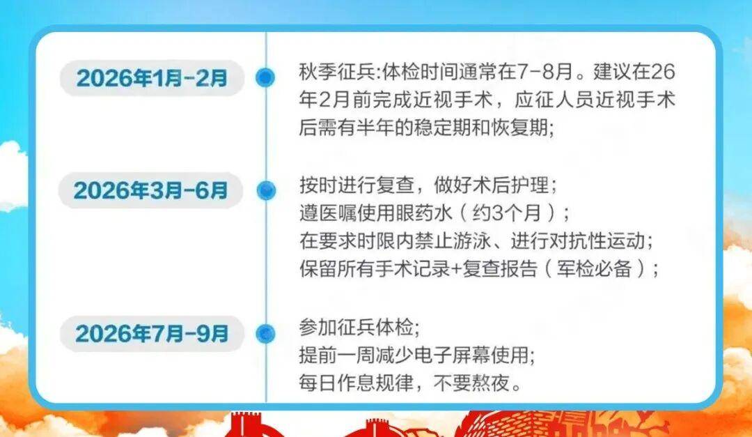 征兵体检对术后恢复时间有明确要求,这是时间规划的核心重点。根据征兵体检标准,近视手术需在体检前半年完成,且术后无并发症,视力达到对应标准才算合格。