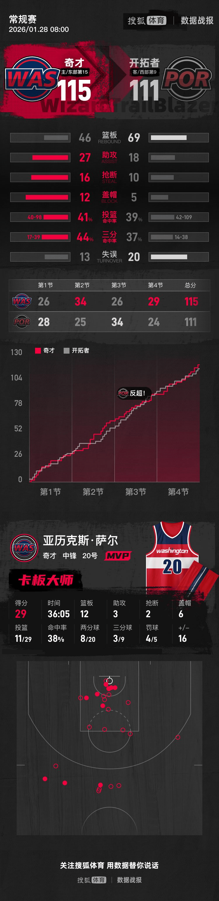 【搜狐体育战报】北京时间1月28日NBA常规赛,主场作战的奇才以115-111击败开拓者,开拓者遭遇3连败。萨尔29分12篮板3助攻,阿夫迪亚17分12篮板3助攻。