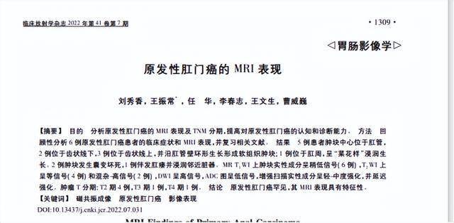 [1]刘秀香,王振常,任华,等.原发性肛门癌的MRI表现[J].临床放射学杂志,2022,