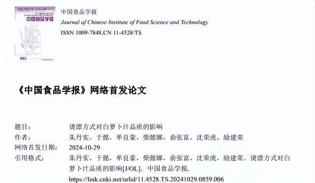 [1]朱丹实,于懿,单良豪,等.烫漂方式对白萝卜汁品质的影响[J/OL].中国食品学报,1-10[2024-12-05].