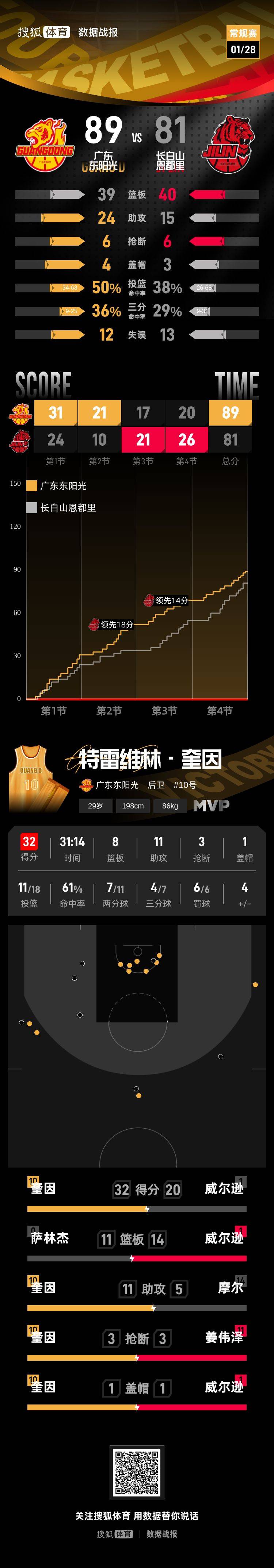 【搜狐体育战报】北京时间1月28日CBA常规赛第21轮,主场作战的广东东阳光以89-81击败长白山恩都里,广东东阳光取得5连胜。特雷维林·奎因32分8篮板11助攻,德万特·威尔逊20分14篮板2助攻。