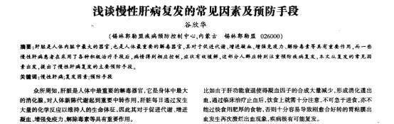 [1]谷欣华.浅谈慢性肝病复发的常见因素及预防手段[J].医学信息(上旬刊),2011