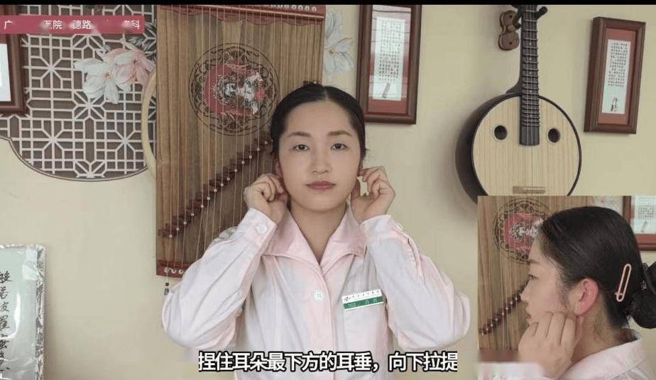 第三节:拉耳垂用拇,食指捏住耳朵最下方的耳垂,向下拉提再松开20次,可缓解头面部疲劳(如眼、舌、面颊),美容养颜、调节内分泌和调整情绪。