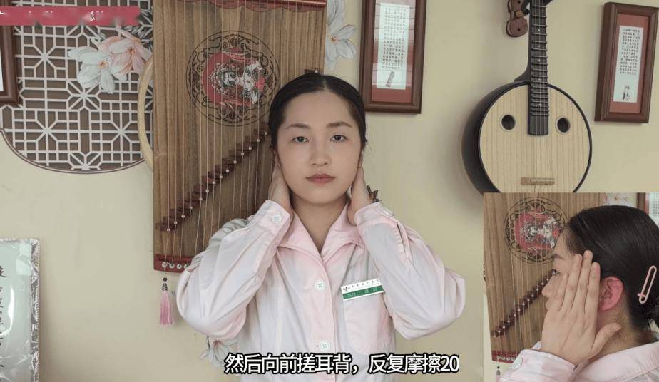 第五节:搓全耳,双手掌摩擦生热,掌心对准耳面向后搓耳,然后向前搓耳背,反复摩擦20次,可缓解神经衰弱、头痛。