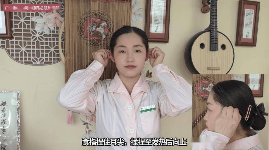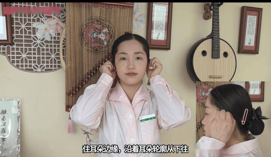 第二节:摩耳轮拇,食指夹住耳朵边缘,沿着耳朵轮廓从下往上揉捏20次,可改善颈椎、腰椎等问题,起健脑明目、补肾聪耳、强身健体等功效。