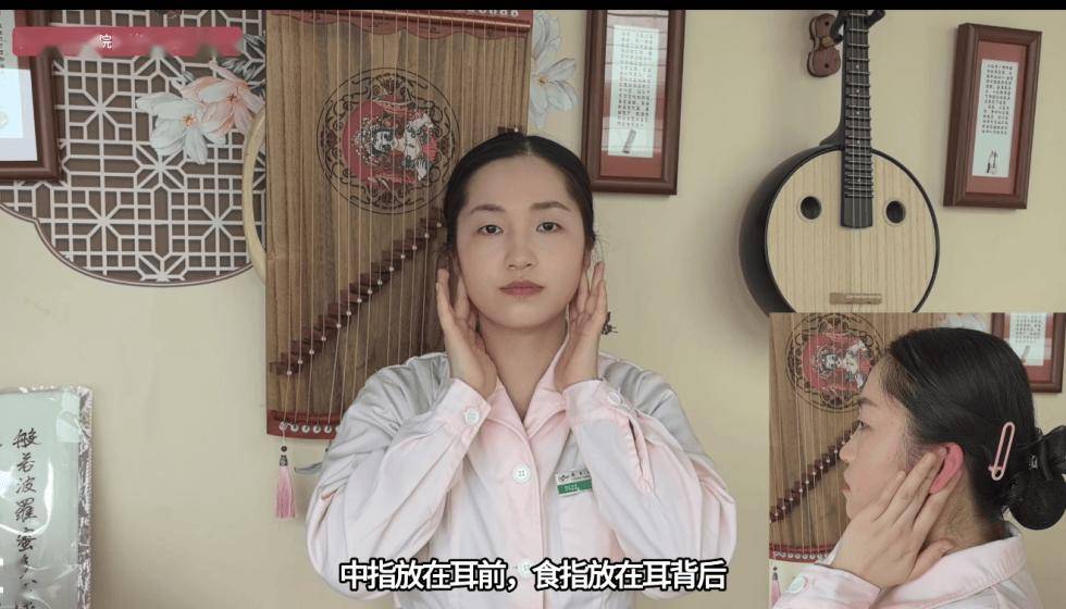 第六节:擦耳屏,中指放在耳前,食指放在耳背后,夹住耳朵上下反复摩擦20次,可疏通全耳经络,促进微循环,提高听力和免疫力。