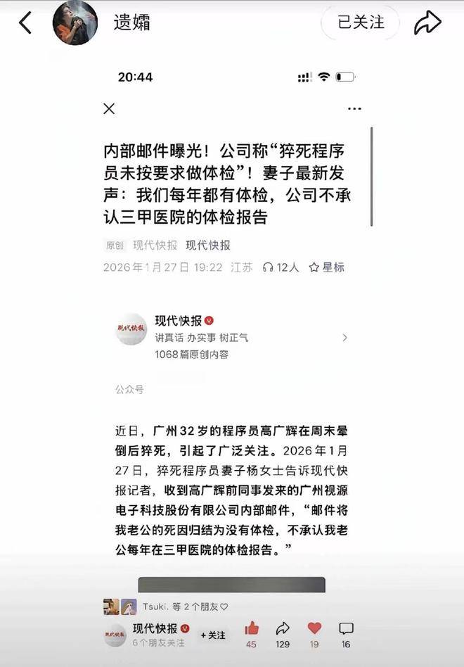 1月27日,广东猝死程序员高广辉的妻子又更新了内容,涉事公司广州视源电子科技股份有限公司的后续操作,却让死者妻子杨女士彻底寒心。