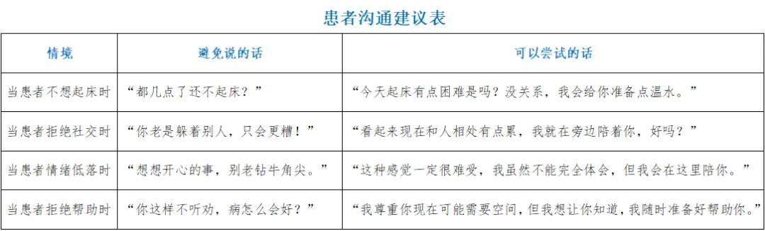 另外,您还可以在生活中以下面的“患者沟通建议表”为参考,与抑郁症患者进行正确沟通。