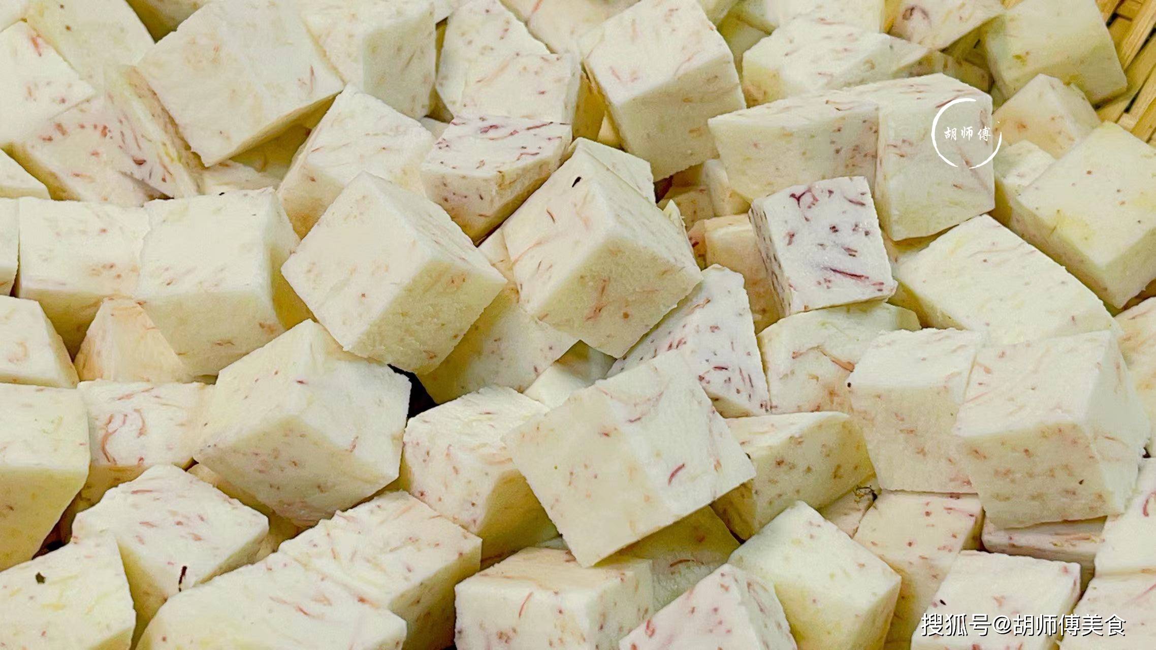 第一步:将香芋削皮后冲洗干净,然后将香芋切成1.5厘米左右的正方形备用。