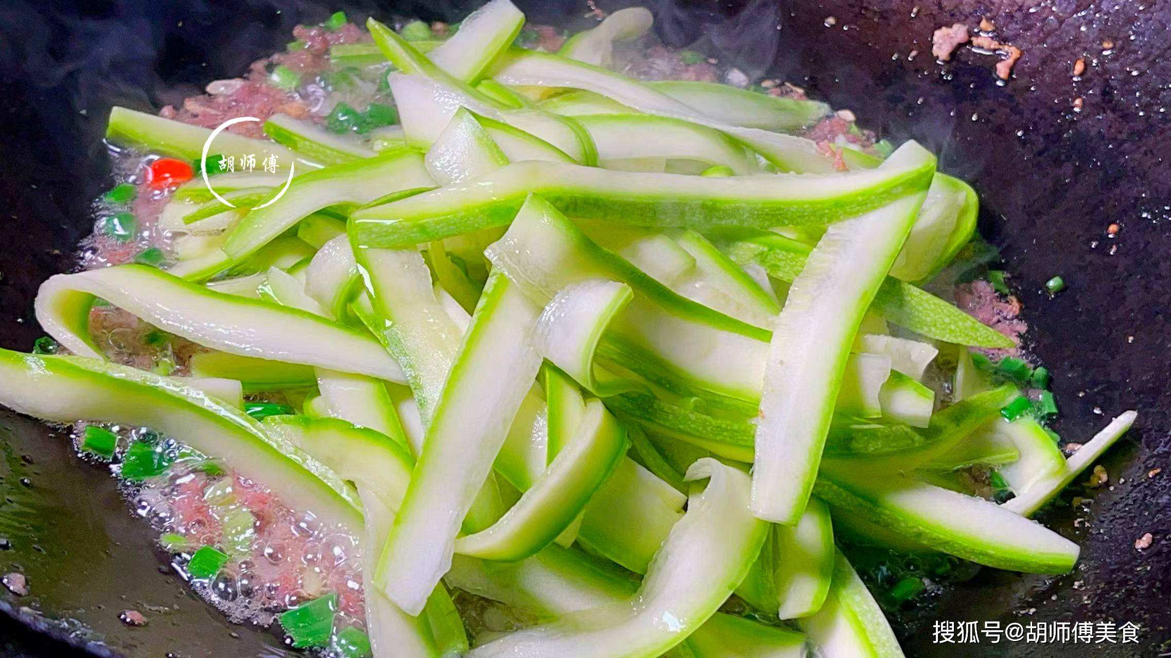 第二步:锅中放入适量油,等油烧热后,把肉末放入锅中,大火将肉末炸成浅黄色后,再把姜末、小米椒、葱末放入锅中爆香,接着再把切好的西葫芦丝放入锅中翻炒半分钟。