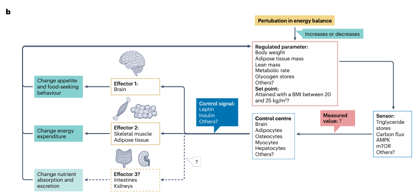 两种模型的核心分歧,还体现在对 “身体究竟在保卫什么” 的回答上。这一 “被调节参数” 至今尚未明确,但研究指出了多个关键候选:可能是脂肪组织量(瘦素作为重要信号,脂肪量变化会通过瘦素调节食欲),可能是肌肉量(身体会优先保护肌肉,脂肪堆积只是次要结果),也可能是糖原储备(碳水化合物平衡可能影响后续进食量),甚至是细胞能量状态(如 ATP 浓度)或糖皮质激素水平。