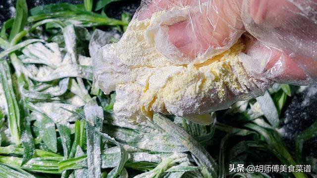 第三步:将玉米面、面粉混合在一起搅拌均匀,然后慢慢的撒到面条菜中,直到每颗面条菜表面都裹上一层薄薄的粉即可,粉不可裹厚,否则会导致面条菜的口感不好。
