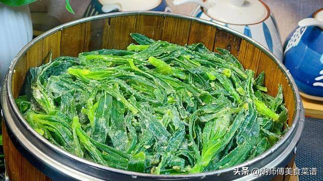 【食材准备】:面条菜250克、玉米面30克、面粉30克、食盐、鸡精、蒜蓉油适量。