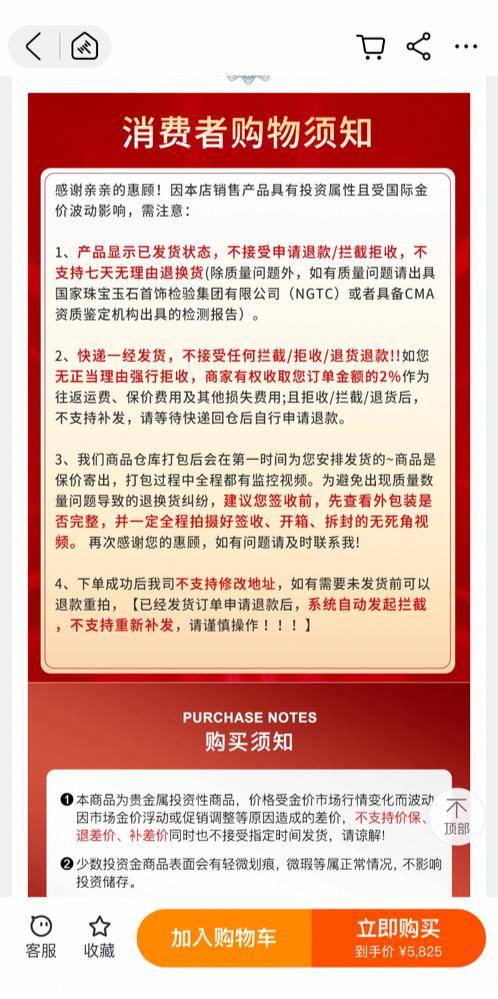 据了解,部分品牌出现在电商平台上的“退货收取一定费用”的规定并非于近日金价下跌时突然出现,而是由来已久,系商家在用户下单前的购买需知。