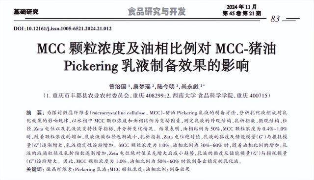 曾治国;康梦瑶;陆今明;尚永彪 MCC颗粒浓度及油相比例对MCC-猪油Pickering乳液制备效果的影响,食品研究与开发 2024-11-10