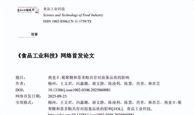 梅州,王文君,冯鑫璐,谢文静,陈凌利,陈慧,肖青,林苏芸.燕麦β-葡聚糖和茶多酚共存对面条品质的影响[J/OL].食品工业科技.