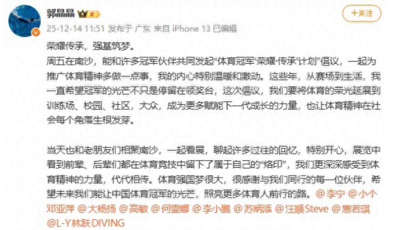 她是那个为国争光的跳水冠军,退役后扎根体育的从业者,低调节俭、不忘初心的普通人。2011年退役后,郭晶晶并没有沉迷于豪门的浮华,而是勤奋备考,取得了国际裁判资格,曾多次担任奥运会、世锦赛的评委或裁判长,用专业守护赛场的公平。她还发起了体育冠军荣耀传承计划,联合邓亚萍等冠军人物助力基层体育发展与青少年成长,传递着正能量。