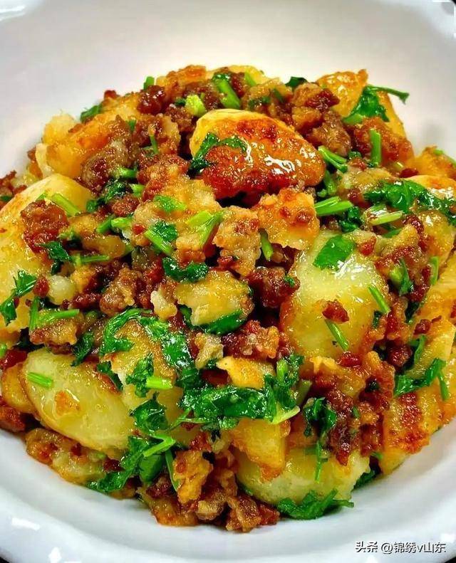 5、倒土豆片炒匀,最后加香菜、白芝麻翻炒均匀即可出锅