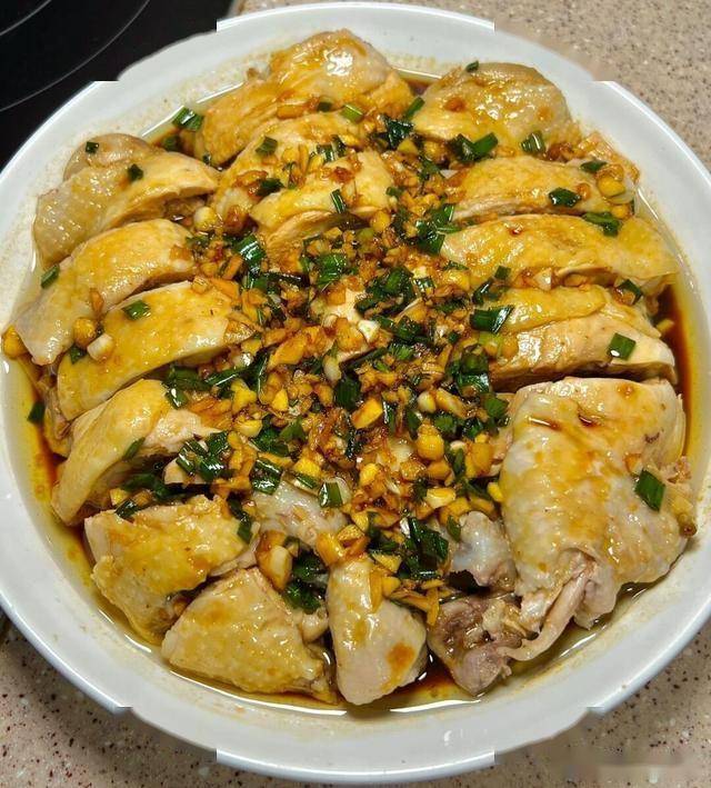 2. 捞出鸡肉立刻放进冰水里泡10分钟(这样皮脆肉嫩),然后捞出切块,摆盘。
