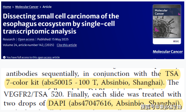 在食管癌领域,食管小细胞癌(SCCE)作为罕见且恶性程度极高的神经内分泌肿瘤,因预后差、治疗手段有限一直是科研难题。近期,中山大学肿瘤防治中心团队在《Molecular Cancer》(2025, 24:142)发表的重磅研究,首次通过单细胞转录组测序系统解析了 SCCE 的肿瘤微环境(TME)和上皮异质性,为治疗提供了全新方向。而 Absin 的多色免疫组化产品,在这项高水平研究中扮演了关键角色,助力科研团队可视化验证核心发现!