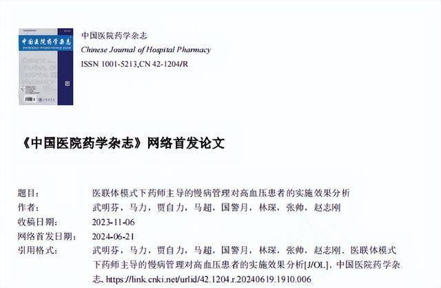 [1] 武明芬.医联体模式下药师主导的慢病管理对高血压患者的实施效果分析,中国医院药学杂志,2024-06-21