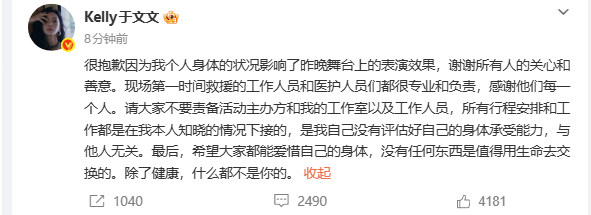 搜狐娱乐讯 2月2日,于文文在社交平台发文回应在演唱会晕倒,她表示感谢大家的关心,称工作人员和医护人员都很专业,希望大家不要责备活动主办方和工作人员:“是我自己没有评估好自己的身体承受能力,与他人无关。”此外,于文文称希望大家都能爱惜身体:“除了健康,什么都不是你的。”