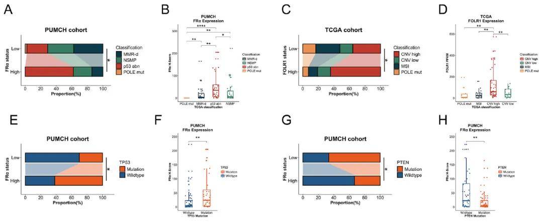 本研究探索了晚期EC中不同FRα/FOLR1表达状态下基因组突变的差异。北京协和医院队列中,TP53突变在FRα高表达EC中最常见(13/21,61.9%),其突变率显著高于FRα低表达EC(27/90,30.0%)(图3E);TCGA队列中观察到相同趋势,但差异无统计学意义。值得注意的是,在两个队列中,TP53突变型EC的FRα H评分/FOLR1 FPKM值均显著高于TP53野生型EC。