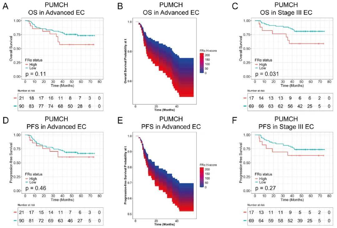 对FIGO Ⅲ期EC病例进行分层分析发现,北京协和医院队列中FRα高表达与更差的OS显著相关,且PFS也略短(图4C、4F);TCGA队列中观察到相似趋势,但差异无统计学意义。而在FIGO Ⅳ期EC队列中,不同FRα表达状态的OS和PFS均无显著差异。