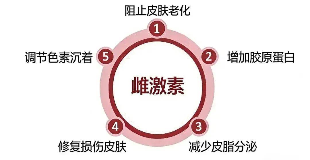 雌激素是女生保持年轻漂亮的法宝,可以阻止皮肤老化,增加胶原蛋白,提高含水量,减少皱纹;还能抵抗雄激素作用导致的皮脂腺分泌增多,促进皮肤损伤的修复,调节色素沉着。