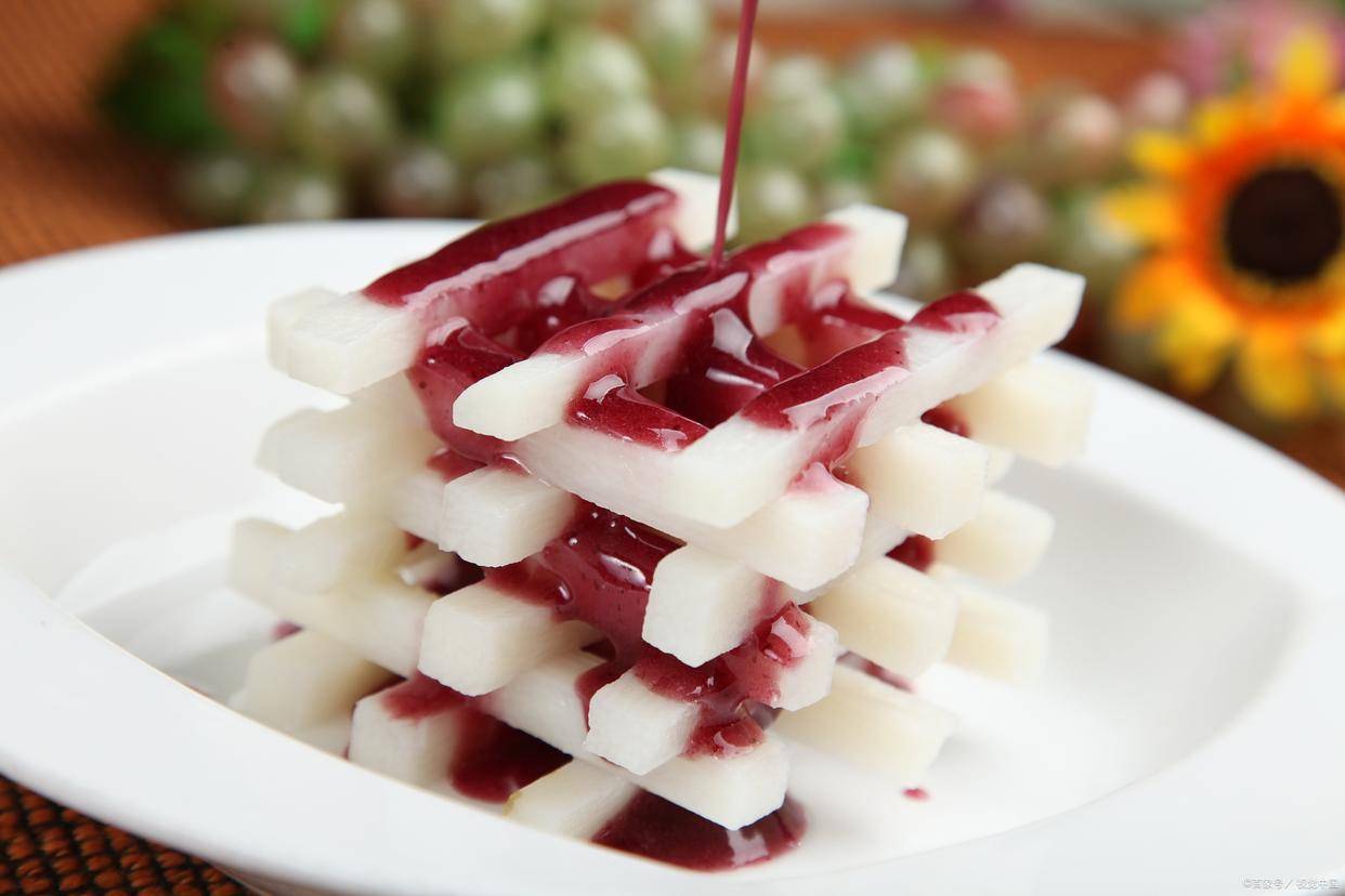 蓝莓山药:这是一道经典的甜品。山药蒸熟碾成泥,塑形后淋上蓝莓果酱。山药泥的绵密细腻搭配蓝莓的酸甜,口感丰富,还能兼顾颜值,老人孩子都喜爱。
