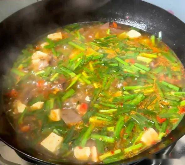 懒人韭菜汤:水烧开放入豆腐块,韭菜段烫10秒,淋点香油,清爽又暖胃。
