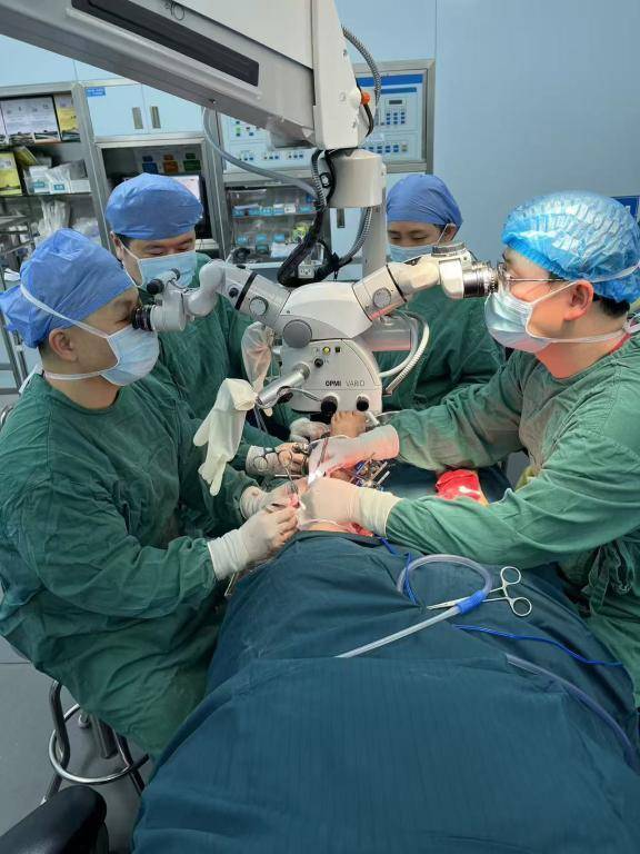 (手足显微外科团队在显微镜下为患者进行血管移植)