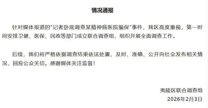 宜昌市夷陵区联合调查组发布通报称,“针对媒体报道的‘记者卧底调查某精神病医院骗保’事件,我区高度重视,第一时间安排卫健、医保、民政等部门成立联合调查组,组织开展全面调查工作。后续,我们将严格依据调查结果依法处置,及时、准确、公开向社会发布相关情况,回应公众关切。”