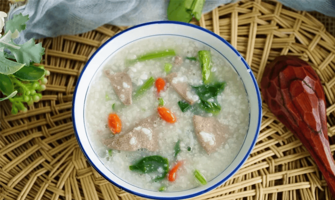 做法:粳米煮至八成熟后,加入焯水后的猪肝片、菠菜段和枸杞子,煮熟调味即可。