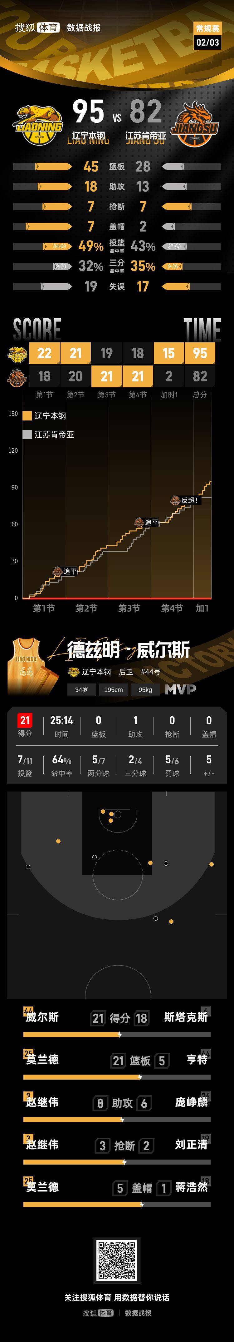 【搜狐体育战报】北京时间2月3日CBA常规赛第23轮,威尔斯常规赛时间最后时刻的空接几乎绝杀了比赛,但辽宁队替补席因为提前进场庆祝被吹罚了技术犯规,斯塔克斯的罚球帮助江苏队将比分扳成80平,将比赛拖入了加时赛!最终主场作战的辽宁本钢没有让到手的胜利飞走,以95-82加时击败江苏肯帝亚,获得两连胜。