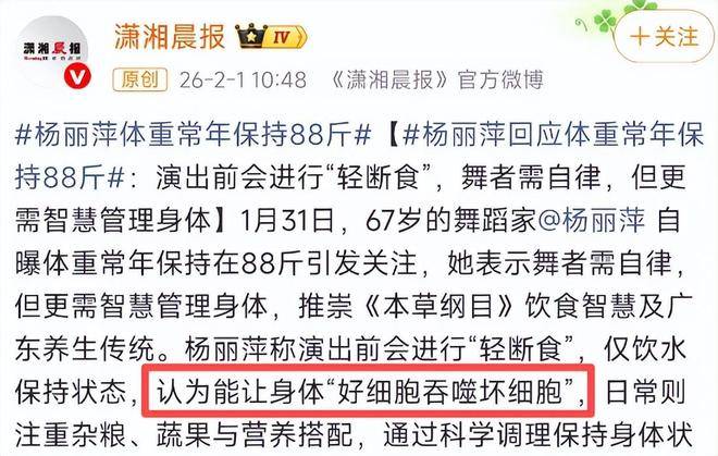 这并非偶尔的节食,而是她每天的固定操作。要知道,杨丽萍的舞台表现力不输任何年轻人。每一场高强度的舞蹈表演,都需要消耗大量的体力,但她却能凭借极低的食量坚持整个演出过程,网友直言:这简直是超人级别。对于这种极致禁食的习惯,杨丽萍给出了她的解释。她称这是轻断食,这种方式不仅有助于身体健康,还能让体内的好细胞去吞噬坏细胞,从而达到身材管理的效果。即使是在没有演出的日子里,她的饮食依旧没有放松,蔬菜为主的清淡饮食,始终保持着克制与健康。