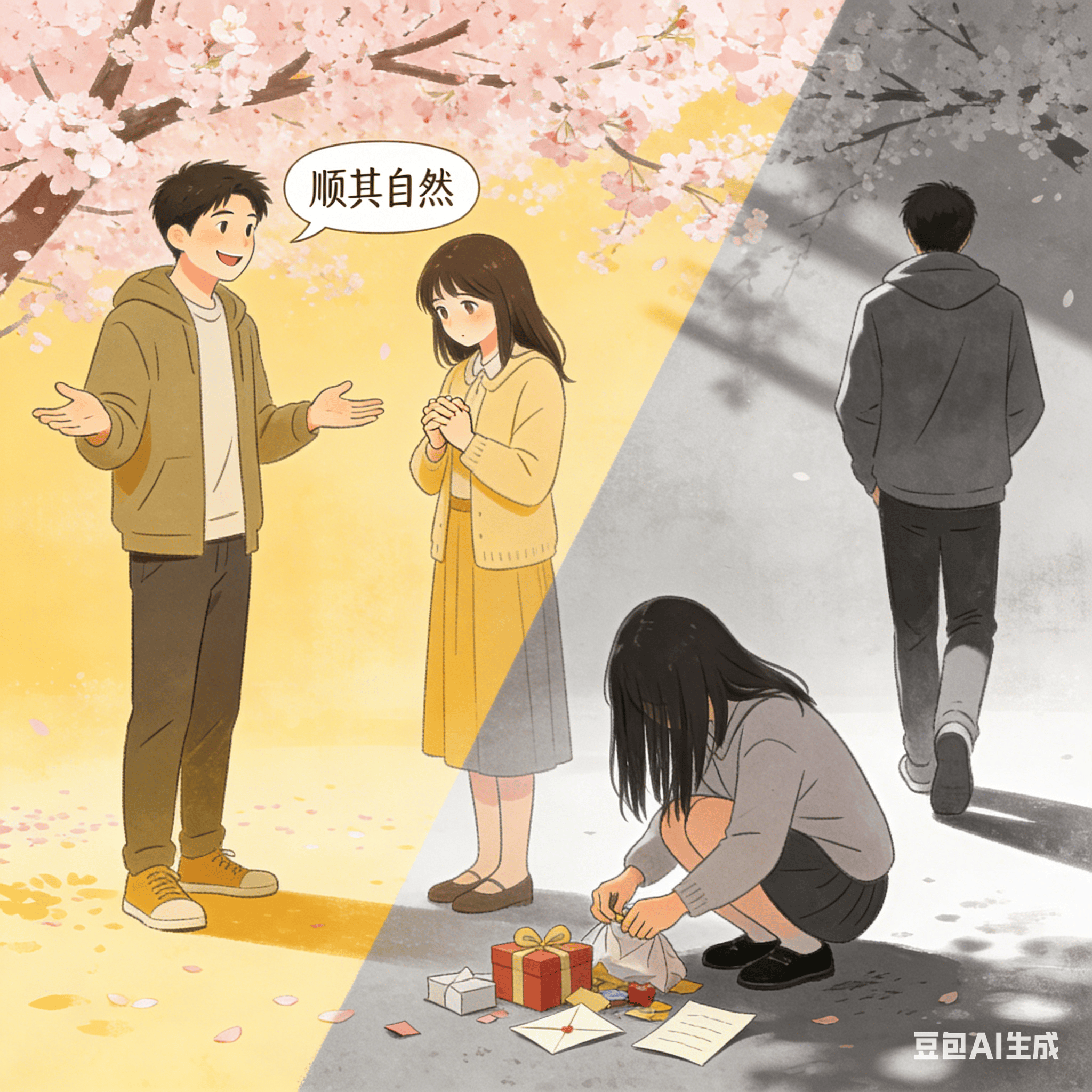 以前觉得“顺其自然”是感情里的松弛感,是不强求、不逼迫,可现在有些男生嘴里的“顺其自然”,翻译过来就是:“我不想公开,不想付出,更不想负责,但你要是愿意倒贴,我也不拒绝。”