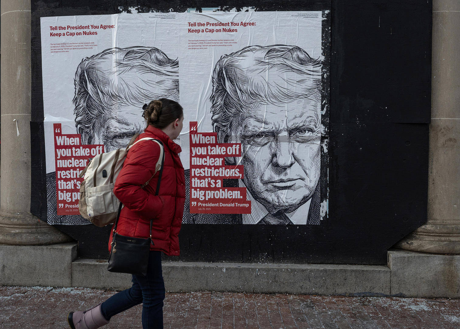 ▲当地时间2026年1月30日,美国华盛顿哥伦比亚特区,一名女子走过一张警告《新削减战略武器条约》即将到期的海报。该海报引用了美国总统特朗普的话 图据视觉中国
