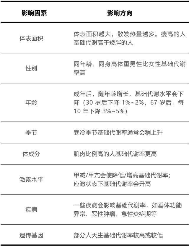 通常,人的基础代谢率和身高体重、年龄、性别、激素水平、季节、体成分(肌肉比例)、疾病状态等因素相关: