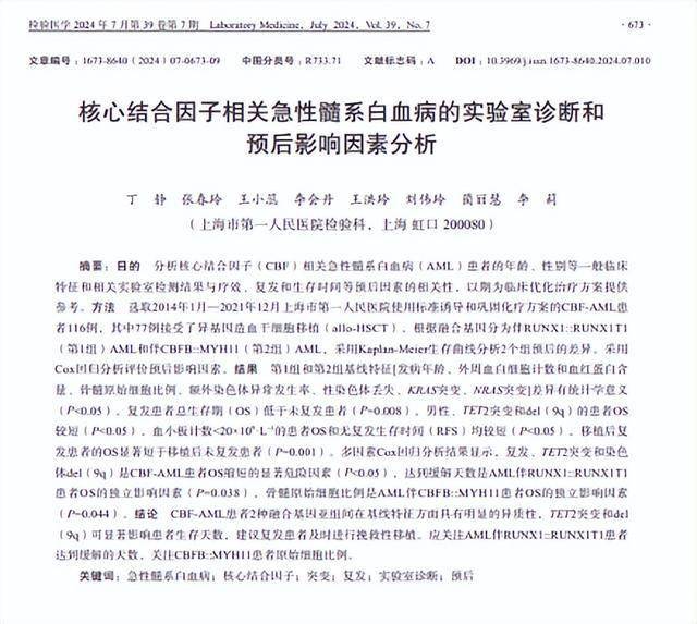 丁静.核心结合因子相关急性髓系白血病的实验室诊断和预后影响因素分析 ,检验医学,2024-07-30