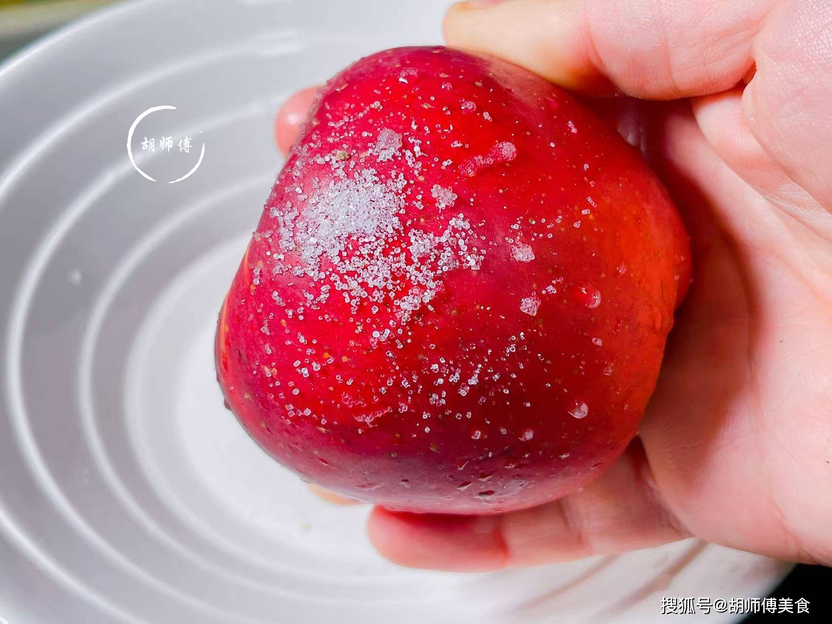 第一步:买回家的苹果,先将苹果表面的皮打湿,然后撒上一点点食盐,接着用力搓苹果,把苹果表面的脏东西都搓掉后,最后再用自来水冲洗干净。苹果不建议大家削皮,因为苹果皮中含有的营养物质,比苹果肉中还要多呢!