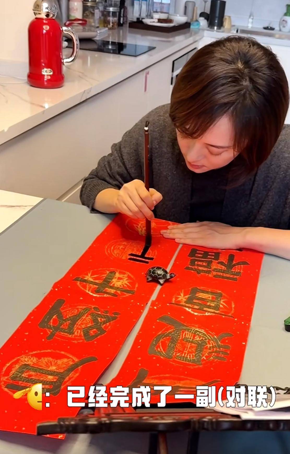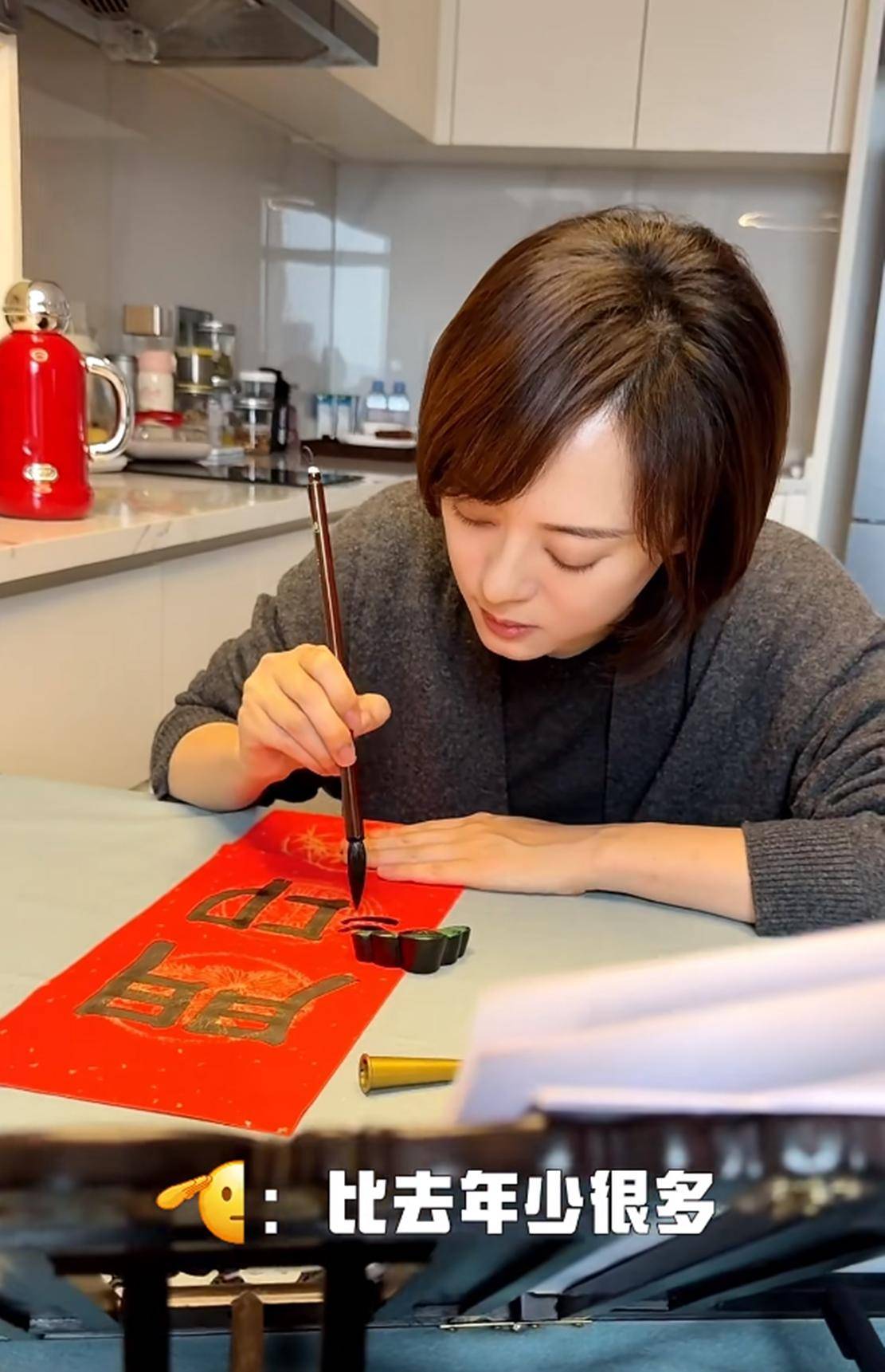 视频中,孙俪身穿一件深灰色的针织开衫,内搭黑色打底衫,齐肩的棕色短发在灯光下微微闪耀。她手持毛笔,正聚精会神地在一张红色的春联纸上写字。孙俪的字迹工整、浑厚有力,墨色浓黑,与红色的纸张形成鲜明对比。她低头写春联的样子,神情专注而沉稳,左手轻轻按住纸面,右手执笔,流露出她多年的书法功底,笔下的每一笔都透露出她对这项艺术的热爱与执着。